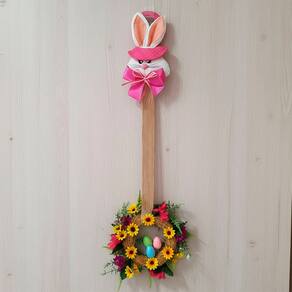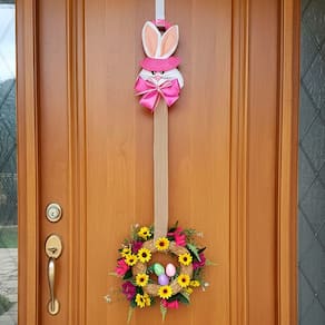 Decore seu ambiente com charme e espírito pascal usando este pendente escapulário em formato de guirlanda com cabeça de coelho, ideal para deixar sua casa ainda mais acolhedora na Páscoa. Com design delicado e tamanho imponente, é perfeito para portas, paredes, vitrines e ambientes internos
