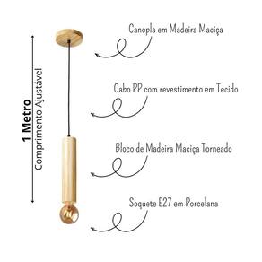 - comprimento ajustável. Máximo de 1 metro; - cabo pp com revestimento em tecido; - bloco único de madeira maciça torneada; - fabricado em madeira maciça legalizada e sustentável; - tensão/voltagem: 110/220v; - soquete padrão e27; - acompanha todo o kit para fixação: travessa, niple e parafusos;