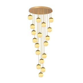 O pendente moderno da Arevo Iluminação é ideal para decorar e iluminar diversos ambientes, salas com pé direito duplo, vão de escada, , living, hall de entrada. A combinação perfeita do acabamento na cor dourado fosco, junto com os globos de vidro, dando um incrível visual brilhante e moderno. Venha se surpreender com essa grande Joia da Iluminação. Feito de alumínio e vidro, esse pendente possui uma base de 60cm de diâmetro e uma altura total de 3,80m, ajustável de acordo com a sua preferência. Os 18 globos de vidro com 15cm cada, proporcionam uma iluminação suave e agradável. O cabo do pendente é feito de fio em tecido doudado, pré configurado com os tamanhos de 20cm, 40cm, 60cm, 80cm, 1,00m, 1,20m, 1,40m, 1,60m, 1,80m, 2,00m, 2,20m, 2,40m, 260m, 2,80m, 3,00m, 3,20m, 3,40m, 3,60m. Assim, você pode ajustar a altura do pendente de acordo com a sua necessidade. Na cor dourado fosco, esse pendente é compatível com lâmpadas modelo G9, podendo ser utilizado com lâmpadas de LED G9. Vale ressaltar que as lâmpadas não estão inclusas. Esse pendente possui voltagem bivolt, o que significa que pode ser utilizado em diferentes sistemas elétricos. O produto inclui 1 pendente dourado fosco e 18 globos de vidro.