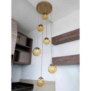 O produto inclui 1 pendente dourado e 6 globos de vidro.