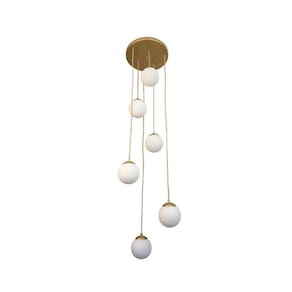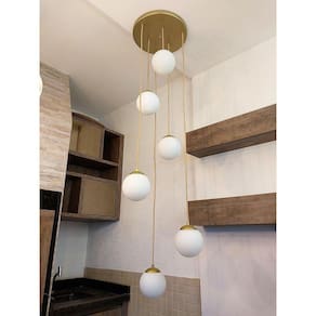 O Pendente Moderno Dourado Pé Direito Alto Sala Vão De Escada acompanha 6 globos de vidro, que completam o visual elegante e moderno da peça.