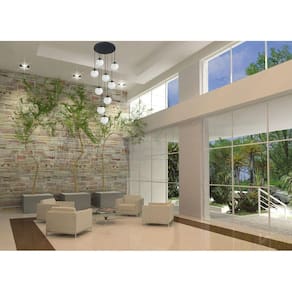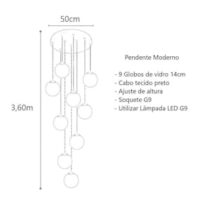 Feito de alumínio e vidro, esse pendente possui uma base de 50cm de diâmetro e uma altura total de 3,60m, ajustável de acordo com a sua preferência. Os 9 globos de vidro, com 14cm cada, proporcionam uma iluminação suave e agradável.