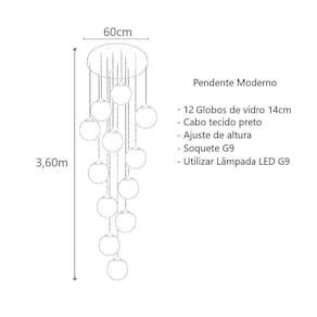Feito de alumínio e vidro, esse pendente possui uma base de 60cm de diâmetro e uma altura total de 3,60m, ajustável de acordo com a sua preferência. Os 12 globos de vidro, com 14cm cada, proporcionam uma iluminação suave e agradável.