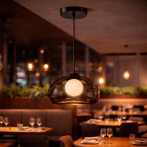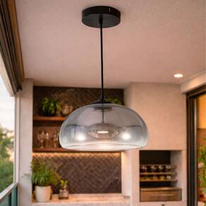 Com cabo de 100cm ajustável na instalação, este pendente de vidro fumê pode ser utilizado individualmente ou em composição com mais unidades, criando um efeito visual harmonioso sobre mesas e bancadas.