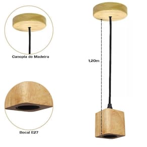 Especificações do Pendente: - Materiais do Pendente: Madeira e fio - Modelo: Pendente Quadrado - Cabo ajustável - Bocal de madeira com rosca E27 - Voltagem: Bivolt - Potência máxima por pendente: Até 50W - Base para fixação no teto: Metal - Tampa/Canopla: Redonda de madeira - Fiação: Fio PP com Acabamento em tecido - Acompanha peças para montagem e instalação do produto - Indicado para uso: Interno