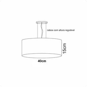 O pendente é indicado para ambientes internos e pode ser instalados em salas de estar ou jantar, quartos, escritórios, etc. Além de atribuir maior personalidade ao ambiente esse modelo também propicia um espaço mais acolhedor por meio da sua iluminação delicada e difusa. Acabamento: PET Flexível Acompanha Cúpula: Sim Acompanha Lâmpada: Não Altura: 15 Altura Regulável: Sim Ambiente de Iluminação: Interno Ambiente Principal: Sala de Jantar Complexidade da Montagem: Baixa: pode ser montado por uma pessoa sozinha Comprimento: 40 Comprimento do Cabo: 120 Cor: Caqui Cor do Acabamento: Bege Cor do Produto: Cáqui Cor Predominante: Bege Diâmetro: 40 Formato: Cilindrico Largura: 40 Linha ou Coleção: Lili Material da Cúpula: PSAI de Alto Impacto Material Principal: Tecido Medida da Canopla (A x D): 0,5x12cm Medida da Cúpula (A x D): 15x40 Necessita Montagem: Não Origem do Produto: Nacional Peso: 1.18 Possui Braços: Não Possui Cristal: Não Potência: 15 Potência Máxima da Lâmpada: 15 W Profundidade: 40 Quantidade de Itens: 1 Quantidade de Lâmpadas: 2 Soquete: E-27 Tipo de Cristal: K9 Tipo de Luminária: Pendente Voltagem: Bivolt Ean: 7899679216316
