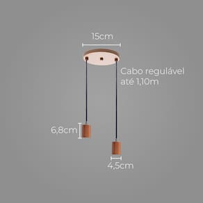 ESPECIFICAÇÕES TÉCNICAS: - Cor: Cobre - Material: Alumínio - Voltagem: Bivolt 110/220V - Soquete: 2x E-27 (lâmpadas não inclusas) - Dimensões Soquete: 6,8 cm de altura x 4,5 cm de diâmetro - Dimensões da Base (teto): 15 cm de diâmetro - Comprimento do Cabo: regulável em até 1,10 m