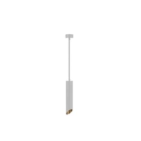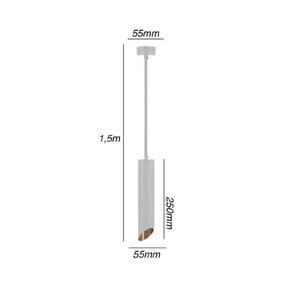 Especificações Pendente: Altura do tubo: 25 cm (250 mm) Diâmetro: 5,5 cm (55 mm) Altura total: até 1,5 m Material: Aluminio Cor: Branco com detalhe interno dourado Soquete: GU10 Tensão: Bivolt