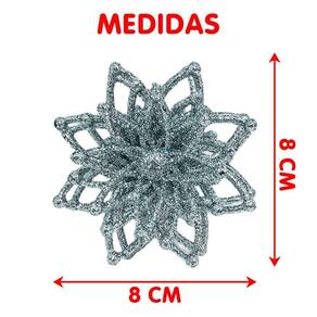 Especificações:Cor: Prata com glitter;Tamanho: 8cm Diâmetro;Material: Plástico;Uso: Árvores de natal, portas e paredesConteúdo Da Embalagem:12 Conjunto com 2 Peças Flores Prata com Glitter de 8cm
