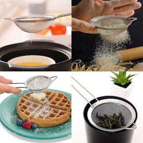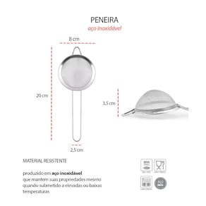 A peneira é desenvolvida em aço inoxidavel, o que torna a peça leve, pratica e muita facil de limpar. Um utensilios que toda cozinha, seja ela profissional ou nao, tem em comum, sao as peneiras. Ideais para separar um alimento do outro de forma rapida e simples, as peneiras sao muito conhecidas na confeitaria. Fabricada com material de alta qualidade e resistencia, ela nao oxida e nao absorve o sabor ou cheiro de alimentos. A Peneira Inox é perfeita para quem procura utensilios com alto nivel de higienizaçao e sem contaminaçao cruzada com os alimentos. Contem: 3 Peneiras Pequena Medidas: 20 x 8 x 3,5 cm Material: Aço Inox