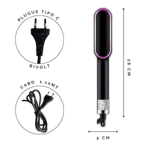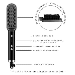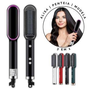 Escova pente alisadora de cabelo, desenvolvida para facilitar e simplificar a sua vida Possui 3 funcionalidades em 1 : alisa , penteia e modela simples e fácil de usar Dispõe de 5 níveis de temperatura, que vai de 130c a no máximo 200c. Para um alisamento rápido, sem frizz e seguro, sua temperatura é constante e tem um design anti-queimaduras Seu uso é indicado para todos os tipos de cabelos.