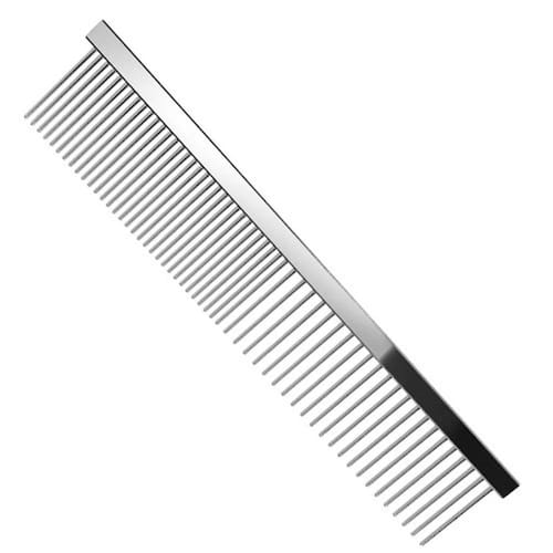 Pente de aço duplo niquelado, estilo greyhound com dimensão de 19×3,5cm. Pinos de aço de alta qualidade, sendo 50% com espaçamento fino e 50% grosso.