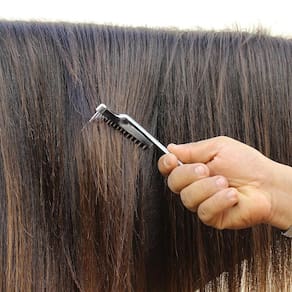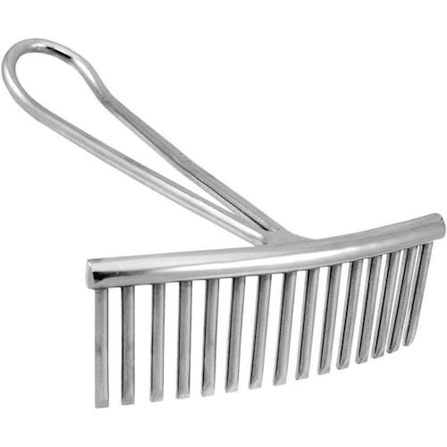 Pente de metal fabricado em ferro cromado, ideal para escovação de crinas e rabos.