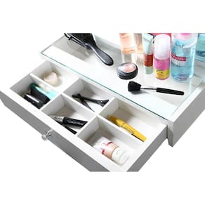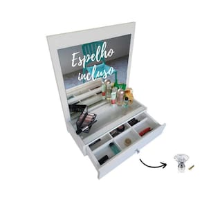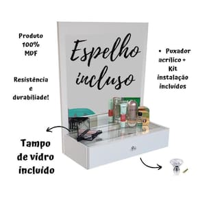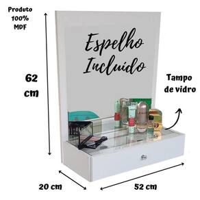 Penteadeira 100% Mdf Suspensa Sophia Com Gaveta E Tampo De Vidro Penteadeira Suspensa de Parede Sophia com Gaveta e Tampo de Vidro, foi desenvolvida para oferecer resistência e durabilidade, confeccionada com material de alta qualidade, inclui espelho reforçado, uma gaveta com divisórias e o tampo de vidro temperado, essa penteadeira além de linda, vai auxiliar no dia a dia na hora de fazer e organizar a sua maquiagem. Esse móvel charmoso e elegante vai trazer mais beleza e funcionalidade para decoração do seu quarto A Penteadeira Suspensa de Parede possui estrutura confeccionada com material 100% MDF.O produto é entregue montado, fácil de instalarGaveta com divisoria de maquiagem.ESPELHO INCLUÍDOMaterial: 100% MDFCor do produto: BrancaMedidas:Espelho: 40 x 45 cm ou 45 40 cm ou 40 x 40 ou 40cm largura x altura OBS: Pode haver variação em questão de cm's no tamanho do espelhoMOLDURA:Largura 52 cmAltura 62GAVETA:Largura 52 cmProfundidade 20cmTAMPO:52 X 20 CM - Suporta até 7 kg - Total suportado penteadeira: Gaveta + tampo de vidro: 15 kg Marca: Marcenaria Sales & Alves