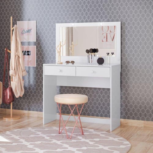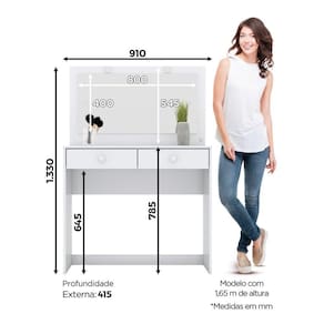 A Penteadeira Daila é a combinação perfeita de funcionalidade, estilo e elegância. Com suas duas gavetas espaçosas, você terá espaço de sobra para organizar todos os seus produtos de beleza e acessórios. Além disso, a iluminação em LEDs embutida proporciona uma luz suave e uniforme, perfeita para você se maquiar e arrumar com precisão. Os puxadores em ABS trazem um toque de sofisticação e durabilidade ao móvel, garantindo que você possa desfrutar da Penteadeira Daila por muitos anos. Seu design moderno e minimalista se adapta facilmente a qualquer estilo de decoração, dando um toque de charme e personalidade ao seu quarto ou closet. Se você busca praticidade e beleza em um mesmo móvel, a Penteadeira Daila é a escolha certa. Acabamento da Gaveta: Pintura UV Acompanha Banqueta: Não Acompanha Lâmpada: 02 Altura do Espelho: 40 Ambiente Principal: Quarto Complexidade da Montagem: Média: pode ser montado por mais de uma pessoa e/ou necessite de maior conhecimento para montagem Cor: Branco Cor do Produto: Branco Cor Interna: Trama Branco Escala de Brilho: Brilhante Escala de Brilho da Gaveta: Fosco Espessura do Espelho: 3 Formato do Espelho: Retangular Gaveta com Chave: Não Informações Complementares: • Iluminação com leds; • Puxadores em ABS; • 2 Gavetas com corrediças metálicas. Itens Inclusos: 1 Penteadeira, Manual de Montagem e Kit Ferragens Largura do Espelho: 80 Linha ou Coleção: Daila Manual de Montagem e Instalação: https://cdn2.madeiramadeira.com.br/atributo/henn-briz-quarto-adulto/1378265-d908-penteadeira-daila.pdf Material da Gaveta: MDP Material do Puxador da Gaveta: ABS Material Principal: MDP Montagem Flex: Não Necessita Montagem: Sim Origem do Produto: Nacional Peso: 27 Peso Máximo por Gaveta: 3 Possui iluminação: Sim Possui Moldura: Não Possui Pés: Não Possui Porta Objetos: Não Possui Portas: Não Possui Prateleiras: Não Possui Vidro: Não Quantidade de Espelho: 01 Recomendações de Uso, Manutenção e Limpeza: Para limpeza de seu móvel, use uma flanela seca ou umedecida. Não utilize produtos químicos que possam danificar o produto. Sapatas Niveladoras: Não Sistema de Montagem: Parafusos e Cavilhas Suporta Até (kg): 46 Tampo Basculante: Não Tipo de Corrediça da Gaveta: Metálica Simples Tipo de Fixação do Espelho: Parafusos Tipo de Lâmpada: Led Tipo de Puxador da Gaveta: Externo
