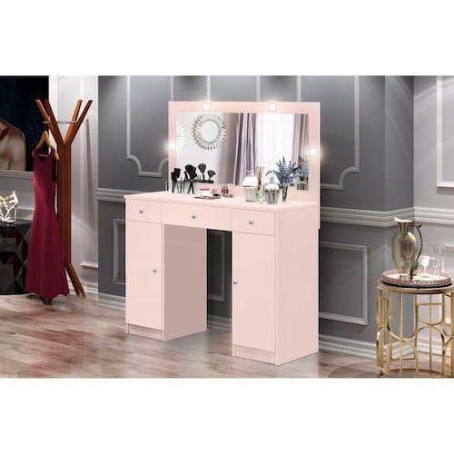 Modelo desenvolvido especialmente para facilitar e organizar pertences de maquiagem e beleza, oferecendo um amplo espelho iluminado por quatro leds, com um amplo espelho, três gavetas, além de duas portas para acomodação de pertences maiores. Acabamento da Gaveta: Pintura UV Acabamento da Porta: Pintura UV Acabamento da Prateleira: Pintura UV Acompanha Banqueta: Não Altura do Espelho: 40 cm Ambiente Principal: Quarto Complexidade da Montagem: Alta: deve ser montado por um montador especializado Cor: Rose Cor do Produto: Rosé Escala de Brilho: Brilhante Escala de Brilho da Porta: Brilhante Escala de Brilho da Prateleira: Brilhante Espessura do Espelho: 3 mm Formato do Espelho: Retangular Gaveta com Chave: Não Itens Inclusos: 1 Penteadeira, Kit Ferragens e Manual de Montagem Largura do Espelho: 93,5 cm Manual de Montagem e Instalação: https://cdn2.madeiramadeira.com.br/atributo/j-a-moveis/1160606-penteadeira-realeza.pdf Material da Gaveta: MDP Material da Porta: MDP Material da Prateleira: MDP Material Principal: MDP Necessita Montagem: Sim Origem do Produto: Nacional Peso: 38,95 kg Peso Máximo por Gaveta: 10 kg Peso Máximo por Prateleira: 10 kg Possui iluminação: Sim Possui Moldura: Não Possui Pés: Não Possui Porta Objetos: Não Possui Portas: 02 Possui Prateleiras: 02 Quantidade de Espelho: 01 Recomendações de Uso, Manutenção e Limpeza: Limpar com pano seco, manter em lugar livre de umidade, ao abrigo de exposição direta ao sol. Sapatas Niveladoras: Sim Sistema de Montagem: Parafusos, Tampas, pregos Suporta Até (kg): 45 kg Tipo de Corrediça da Gaveta: Metálica Simples Tipo de Dobradiça/Corrediça da Porta: Alumínio Tipo de Fixação do Espelho: Botão Francês Tipo de Porta: Bater Tipo de Puxador da Gaveta: Externo Tipo de Puxador da Porta: Externo undefined: 823661