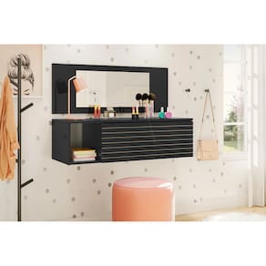 Hoje em dia os imóveis ,principalmente nos grandes centros, estão com ambientes mais compactos. Pensando nisso nos da Peternella Móveis desenvolvemos a Penteadeira Afrodite ,que é a 100% fabricada em MDP/MDF bio-sustentável de 15 mm, com espelho incluso.. este item conta ainda com 1 gaveta e 1 nicho, que possibilitam armazenar os mais distintos objetos. Cor: Preto Marca: Peternella Modelo: Joy Largura: 90 Altura: 60 Profundidade: 33,5 Peso: 14,40