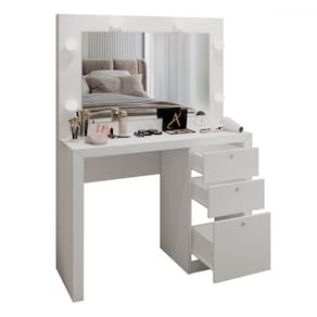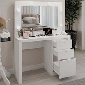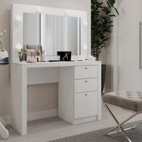 O(a) Penteadeira Camarim 3 Gavetas Beauty com Espelho e Bocais para Lâmpada Branco - Loja é produzido em MDP na escala de brilho Brilho, e possui um grau de dificuldade de montagem: Fácil.