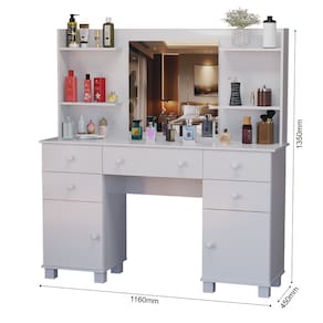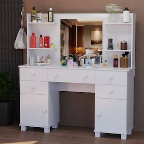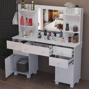 Amplo Espaço de Armazenamento: 5 gavetas + 2 portas + prateleiras laterais para organizar maquiagem, perfumes, joias e acessórios.