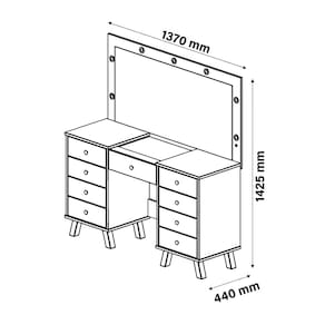 Penteadeira Camarim Eloá 9 Gavetas Retro Moderno Patrimar Móveis A Penteadeira Camarim Eloá é um móvel bastante útil que vai agregar beleza, luxo e sofisticação ao seu quarto. Possui estrutura em mdf de excelente qualidade que proporciona maior durabilidade e resistência ao produto, conta com 9 gavetas sendo a central com colmeia e amplo espaço interno para maior organização dos seus pertences. Designer moderno desenvolvida para lhe proporcionar maior visibilidade na hora de fazer a sua maquiagem, pois conta com leds de alta qualidade. EspecificaçõesPenteadeira Camarim Eloá-100% MDF-Puxadores em metal-Corrediças telescópicas-Colmeia e vidro 04 mm-Iluminação de Led-Pés em madeira maciçaMedidas da PenteadeiraAltura: 142,5 cmLargura: 137 cmProfundidade: 44 cmPeso: 69,10 Kg0,1427 m³Produto NovoProduto Vai desmontadoMontagem por conta do CompradorAcompanha kit e manual para montagem