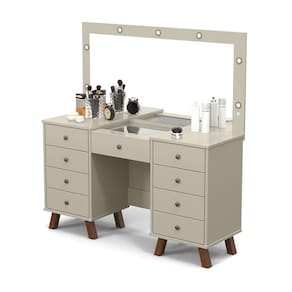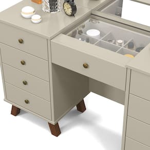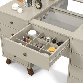 A Penteadeira Camarim Eloá é simplesmente perfeita, agregando beleza e sofisticação ao seu quarto. Ela possui um espelho com medidas generosas, iluminação em LED e puxadores metálicos maravilhosos, como não se apaixonar? Além de todas essas qualidades, o produto é constituído em 100% MDF e conta com 09 gavetas com corrediças telescópicas, sendo que a do meio possui divisórias, ou seja, é o que você está procurando! Uma penteadeira lindíssima que deixa as suas maquiagens e assessórios organizados. Imperdível, aproveite e adquira já a sua!