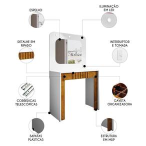 A gaveta organizadora ripada da Penteadeira possui corrediças telescópicas que proporciona abertura suave e total, facilitando o uso e oferecendo espaço ideal para manter os itens bem organizados.