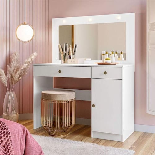 Está montando seu quarto? Então apresentamos para você esta bela penteadeira da linha Bella. Com uma porta e duas gavetas equipadas com corrediças telescópicas, sendo uma delas com comeia para melhor organização, perfeito para guardar suas maquiagens e acessórios. O painel com espelho, acompanhado por luminárias em LED proporciona uma iluminação suave e eficiente. Fabricado pela Moval, é desenvolvido em MDP de qualidade. Sendo a escolha ideal para quem busca estilo, conforto e praticidade para compor o quarto dos seus sonhos, aproveite!