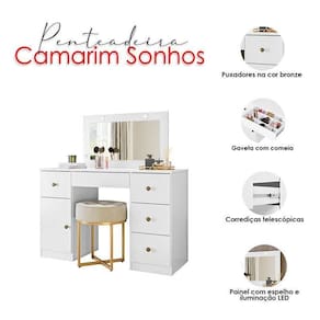 Começou a montar seu quarto? Então apresentamos para você esta bela penteadeira da linha Sonhos. Composto por uma porta e cinco gavetas espaçosas equipadas com corrediças telescópicas. O destaque é para a gaveta central com comeia para melhor organização. O painel com espelho e iluminação em LED garante uma ótima claridade, criando um verdadeiro ambiente de camarim em seu quarto. Fabricado pela Moval, é desenvolvido em MDP de alta qualidade, combinando beleza, praticidade e boa durabilidade. Transforme seu momento em uma experiência única, aproveite!