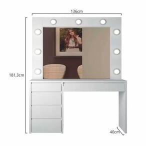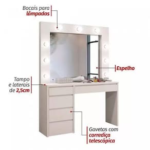 Penteadeira com espelho Berlim é uma união de organização e sofisticação. A belíssima penteadeira camarim deixa para traz os traços Retrô das penteadeiras, e é recriada com detalhes e linhas retas muito modernas além de permitir uma melhor organização. Não Acompanha lâmpadas. Informações Técnicas