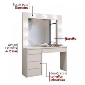 Penteadeira com espelho Berlim e uma uniao de organizacao e sofisticacao. A belissima penteadeira camarim deixa para traz os tracos Retro das penteadeiras, e e recriada com detalhes e linhas retas muito modernas alem de permitir uma melhor organizacao. Nao Acompanha lampadas.