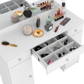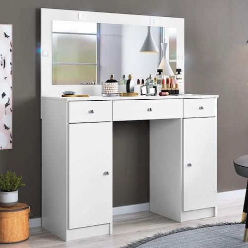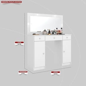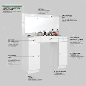 Penteadeira Camarim Carisma Com Espelho E Gaveta Nicho Branco - Demóbile Características Estrutura em MDP ; Corrediças telescópicas na gaveta central ; Luz de LED ; 1 Gaveta com divisória colmeia ; Espelho ; 2 Gavetas de armazenamento ; Puxadores de plastico ABS ; Acabemento pintura UV Dimensões Penteadeira Carisma Altura: 134 cm ; Largura: 108 cm ; Profundidade: 41 cm ;