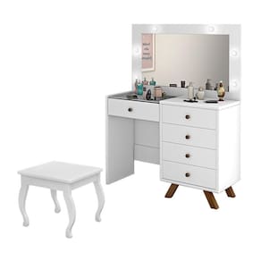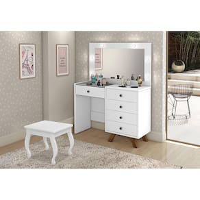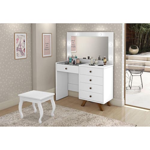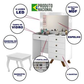 Penteadeira Camarim com Banqueta Espelho e Luzes Led Luna Branco A Penteadeira Luna É 100% Mdf, Sua Pintura É Uv Anti Risco, Puxadores em Metal com Acabamento Envelhecido, Corrediças Telescópicas, Possui Colmeia na Gaveta Central, Bases Laterais e Tampo Mdf 18mm, Moldura do Espelho Mdf 15mm e 20mm, o Espelho Tem 3mm e o Vidro do Tampo 4mm. Possuindo 6 Led de Luz Branca, Pés em Madeira de Reflorestamento e 5 Gavetas com a Frente em Mdf 15mm.