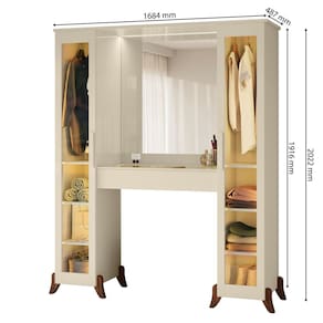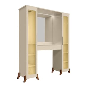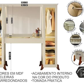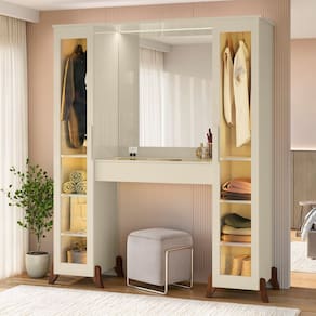 Camarim Star Reflecta RV Móveis é ideal para quem deseja transformar o momento de se arrumar em uma experiência prática e prazerosa. Mais que um móvel, ele cria um cantinho de maquiagem completo, bonito e funcional. Seu diferencial está na iluminação LED com temperatura de cor ideal para maquiagem, garantindo fidelidade nas cores e precisão nos detalhes. O espelho amplo traz mais segurança na finalização, sendo perfeito também para fotos e vídeos. Possui tomada integrada para facilitar o uso de secador, chapinha ou modelador. Na organização, são 6 prateleiras para perfumes, cosméticos e acessórios, mantendo tudo à mão. Os puxadores em MDF, acabamento interno na cor do produto e 8 pés arredondados reforçam estabilidade e visual. Dimensões: Alt. 191,6 cm | Larg. 168,4 cm | Prof. 48,7 cm. Acabamento da Gaveta: Pintura Texturizada UV Acabamento da Porta: Pintura UV Acabamento da Prateleira: Pintura UV Acabamento dos Pés: Pintura Acompanha Banqueta: Não Acompanha Lâmpada: 03 Altura do Espelho: 99,8 cm Altura dos Pés: 10,5 cm Ambiente Principal: Quarto codigo_ean: 7900288325723 Complexidade da Montagem: Média: pode ser montado por mais de uma pessoa e/ou necessite de maior conhecimento para montagem Cor: Off White Cor do Produto: Off White Cor do Puxador: Off White Cor Flex: Não Cor Interna: Off White Escala de Brilho: Fosco Escala de Brilho da Gaveta: Fosco Escala de Brilho da Porta: Fosco Escala de Brilho da Prateleira: Fosco Espessura do Espelho: 3 mm Espessura do Vidro: 3 mm Fita Integrada: Não Formato do Espelho: Retangular Gaveta com Chave: Não Informações Complementares: Seguir as Orientações do Manual de Uso e Montagem Itens Inclusos: 1 Penteadeira e Kit Ferragens Largura do Espelho: 90,4 cm Linha ou Coleção: Star Manual de Montagem e Instalação: https://product-hub-prd.madeiramadeira.com.br/747482823/documents/a9a96e48-ab2e-4c52-a2c1-c4c20ba6146a3379946365917703824994719.pdf Marca: RV Móveis Material da Gaveta: MDP Material da Porta: Vidro Material da Prateleira: MDP Material do Puxador da Porta: MDF Material dos Pés: Madeira Maciça Material Principal: MDF/MDP Montagem Flex: Não Necessita Montagem: Sim Origem do Produto: Nacional Pés Reguláveis: Não Peso: 95 kg Peso Máximo por Gaveta: 5 kg Peso Máximo por Prateleira: 5 kg Possui iluminação: Sim Possui Moldura: Não Possui Pés: 08 Possui Porta Objetos: Sim Possui Portas: 02 Possui Prateleiras: 06 Possui Rodízio: Não Possui Vidro: Sim Quantidade de Espelho: 01 Recomendações de Uso, Manutenção e Limpeza: Seguir as Orientações do Manual de Uso e Montagem Sapatas Niveladoras: Não Sistema de Montagem: Parafusos, Cavilhas e Minifix Suporta Até (kg): 80 kg Tampo Basculante: Não Tipo de Corrediça da Gaveta: Metálica Telescópica Tipo de Dobradiça/Corrediça da Porta: Metálica Tipo de Fixação do Espelho: Fita Dupla Face Tipo de Lâmpada: LED Tipo de Madeira Maciça dos Pés: Pinus Tipo de Porta: Bater Tipo de Puxador da Gaveta: Não Possui - Abertura por Fecho Toque Tipo de Puxador da Porta: Externo