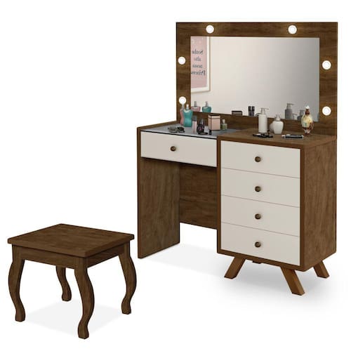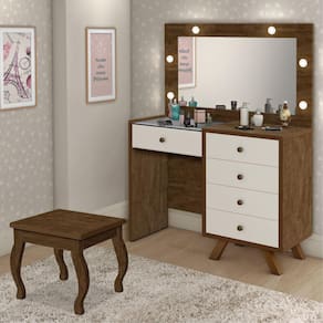 Estrutura: MDF/MDPAcabamento: Pintura U.V, anti-riscoGavetas: Sim, 05 gavetas com corrediças telescópicas, frente em MDF 15 mm, sendo a gaveta central com colméia para organizar e guarda suas joias, relógiosTampo: Vidro, para melhor visualização do separador de joias da gavetaEspelho: Sim, no quadro central de 3 mm de espessura e moldura do espelho em MDF 15 mm e 20 mmQuadro: Com espelho, 06 jogos de lâmpadas de LED (lâmpadas já inclusa), para uma maquiagem e iluminação perfeitaPuxadores: Sim, em metal com acabamento envelhecidoPés: Sim, em madeira de reflorestamentoBanqueta: Sim, inclusa