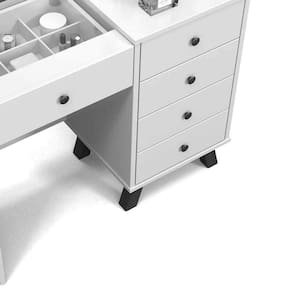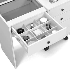A Penteadeira Mila é um móvel bastante útil, que vai agregar beleza e sofisticação ao seu quarto. Possui estrutura confeccionada em MDF de excelente qualidade que proporciona maior durabilidade e resistência ao produto, conta com 1 gaveta e amplo espaço interno para maior organização dos seus pertences, portas joias. Confira! Quadro com 6 jogos de lâmpadas de LED, já incluso, para uma maquiagem e iluminação perfeita.