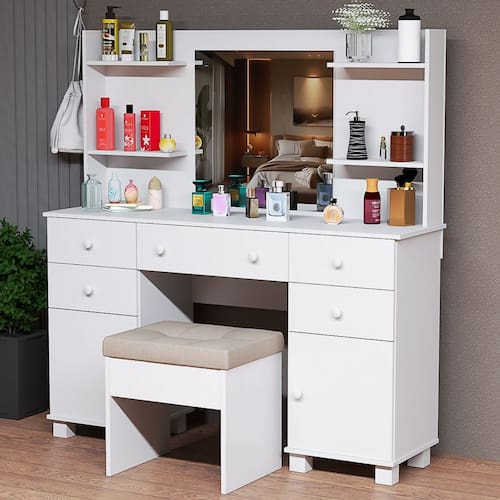 Penteadeira Camarim Oasis com Espelho, Gavetas, Portas e Prateleiras Transforme o seu quarto em um verdadeiro camarim com a Penteadeira Camarim Oasis, um móvel moderno, elegante e extremamente funcional. Ideal para organizar maquiagens, perfumes, cosméticos e acessórios, ela une design sofisticado e praticidade para o seu dia a dia. Ela oferece estrutura resistente e acabamento impecável, garantindo durabilidade e beleza por muitos anos.