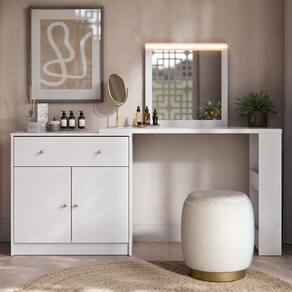 A Penteadeira Camarim de Canto Aura combina elegância e praticidade em um design moderno e funcional. Produzida em MDF e MDP com pintura UV, oferece resistência e excelente acabamento. Possui 2 portas com dobradiças metálicas, prateleira interna e 1 gaveta com corrediças telescópicas e colmeia organizadora. Conta ainda com perfil de LED com iluminação embutida e espelho de 3mm que proporcionam um toque sofisticado. O tampo móvel permite escolher o lado da montagem, adaptando-se facilmente ao espaço. Completa com mini estante para objetos e puxadores pontuais, é ideal para quem busca beleza e organização em um só móvel.