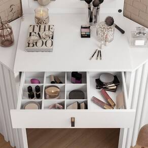 Complete o seu quarto com a elegante e funcional Penteadeira Camarim de Canto com Espelho 1 Gaveta Glitter Branco, da Albatroz. Essa peça contemporânea apresenta uma gaveta com corrediças telescópicas suaves, garantindo fácil acesso e operação contínua. Perfeita para organizar seus itens essenciais, ela oferece divisões organizacionais para manter tudo em seu lugar. Além disso, essa penteadeira de canto não é apenas prática, mas também dá um toque de sofisticação a qualquer espaço. O puxador em ABS com acabamento em sintético exala elegância, enquanto as laterais com acabamento ripado criam uma estética moderna. Se você quer um cantinho só seu para elaborar as mais diversas makes e, ainda, dar um toque especial ao seu quarto, essa penteadeira com LED é a escolha perfeita. Isso mesmo, com LED para você iluminar a sua rotina de beleza e proporcionar uma iluminação ideal para que você possa aplicar maquiagem sem esforço ou pentear o cabelo com precisão. Diga adeus aos cantos mal iluminados e dê as boas-vindas a uma área bem iluminada, dedicada aos seus cuidados pessoais. Transforme o seu quarto em um paraíso de estilo e organização com a penteadeira camarim Glitter, feita para você brilhar. Garanta hoje mesmo a sua. Dimensões do ProdutoLargura: 114 cm. Altura: 140 cm. Profundidade: 54 cm. Peso: 30 kg. Outras MedidasInterna da Gaveta (L x A x P): 52 x 7 x 33 cm. Espelho (L x A): 53 x 51 cm. Características do ProdutoMaterial da estrutura: MDP. Acabamento: Pintura UV. Escala de Brilho: Fosco. Peso Suportado: 8kg distribuídos. Possui Portas: Não. Tipo de Puxadores: ABS com acabamento sintético. Quantidade de Gavetas: 1 Gaveta. Tipo de Corrediças: Telescópicas. Possui Prateleiras: Não. Possui Pés: Não. Possui Espelho: Sim. Possui LED: Sim. Diferenciais: - Design moderno. - Puxadores de ABS com acabamento sintético. - Laterais com acabamento ripado. - Gaveta com divisórias organizadoras. Sistema de Montagem: Parafusos/Cavilhas/Minifix. Manual de Montagem: Sim. Complexidade da Montagem: Média. Volumes: 1 Volume. Conteúdo da Embalagem: 1 Penteadeira. Garantia do Fabricante: 90 dias contra defeito de fabricação. Montagem: Recomendamos que seja feita por um profissional. Recomendação de Limpeza: Utilize pano levemente úmido. Observações importantes- Produto para uso residencial em ambiente interno, não devendo ficar exposto diretamente ao sol, calor e umidades excessivas. - Pode haver alguma diferença de tonalidade entre a imagem e o produto real, por conta do tratamento de imagens e a calibração de cores do seu monitor. - As imagens são meramente ilustrativas, não acompanham objetos de decoração e eletrônicos. - Confira o estado da embalagem, não devendo assinar o comprovante em caso de danos. - Não asseguramos, no ato da entrega, por subir escadas/elevadores, pelo transporte por guincho em apartamentos ou montagem, desmontagem e instalações. Eventuais despesas são por conta do comprador. - Confira as dimensões do produto e certifique-se de que passará normalmente por supostos elevadores, portas, escadas e/ou corredores de sua residência.