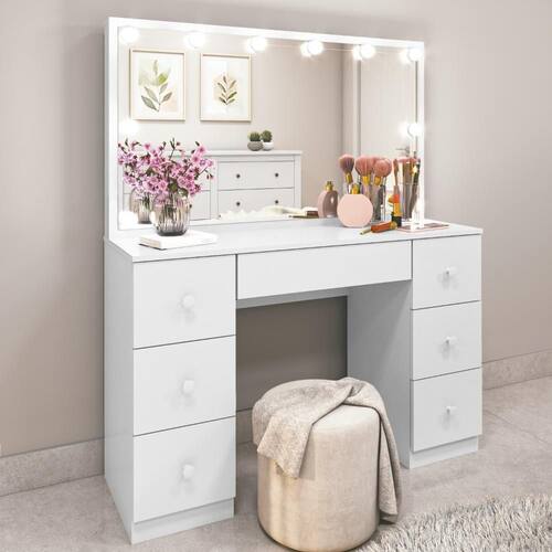 Produzida em MDP de alta qualidade com chapas de 15mm, a Penteadeira Lívia oferece resistência e durabilidade. São 7 gavetas espaçosas com corrediças telescópicas, perfeitas para manter maquiagens, acessórios e produtos sempre organizados, além de divisores internos que facilitam ainda mais o uso.