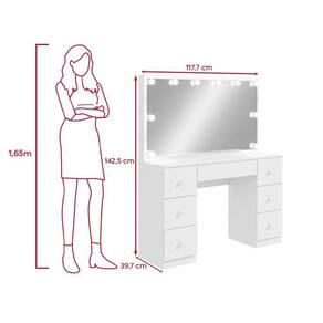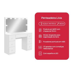 Principal Caracteristica1: Divisor de gavetas para organização de itens | Materiais da estrutura: Produto em MDP com chapas de 15mm | Quantidade de Portas: Não possui | Cor: Branco | Requer montagem: Sim | Fabricante: Moveis Lopas | Com espelho: Sim | Com corrediças telescópicas: Sim | Acessórios de montagem incluídos: Sim | Modelo: Easy Like | Altura: 142,5 cm | Peso do Produto: 55,58 | Garantia em Meses: 3 meses | Numero de itens: 1 | Acabamento: Pintura U.V Brilho | Certificado de teste: Sim | Largura: 117,7 cm | part_number: 1 | Necessário bateria: Sim | Profundidade: 39,7 cm | AlturaxLarguraxProfundidade: 142,5x117,7x39,7cm | Numero de volumes: 2 | Principal Caracteristica 2: Puxadores pontuais em ABS | is_fragile: Sim | Número de itens: 1 | Iluminação: Acompanha kit de iluminação camarim. | Número de gavetas: 7 gavetas
