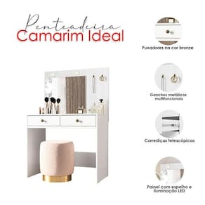 Começou a procurar móveis para montar seu quarto? Então apresentamos para você esta bela penteadeira da linha Ideal. Equipada com duas gavetas espaçosas com corrediças telescópicas, garantindo uma abertura suave e de maior resistência ao uso diário. Conta ainda com ganchos metálicos multifuncionais, perfeito para organizar seus acessórios. Seu destaque fica por conta do painel com espelho e luminárias em LED, proporcionando uma iluminação perfeita para você se cuidar. Fabricado pela Moval, é desenvolvido em MDP de alta qualidade. Sendo uma excelente escolha para quem está buscando sofisticação, organização e funcionalidade, tornando sua rotina mais prática e estilosa, aproveite!