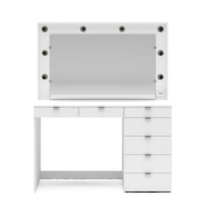 Características: Estrutura MDP Pintura UV 08 Gavetas com corrediças metálicas Suporte para 08 lâmpadas Puxadores de Metal Peso suportado no Tampo: 15kg Peso suportado por Gaveta: 3kg Não acompanha lâmpadas Compatível com lâmpadas bulbo LED modelo E27, de 3W a 6W de potência