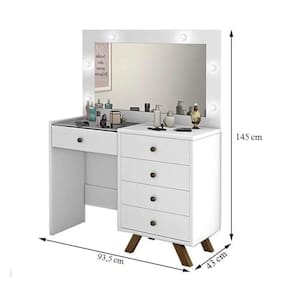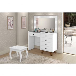 Organize maquiagens, acessórios e cosméticos com a penteadeira camarim Luna, modelo retrô com espelho e LED ideal para o quarto ou closet. Com 9 gavetas, incluindo gaveta central com colmeia, oferece espaço dedicado para manter cada item sempre à mão. O espelho inteiro com kit de LED bivolt integrado garante iluminação de qualidade, favorecendo a visualização dos detalhes na hora de se maquiar ou arrumar os cabelos. A estrutura em MDF com acabamento branco brilhante combina facilmente com diferentes estilos de decoração. Os pés em madeira e as corrediças telescópicas contribuem para um uso prático no dia a dia.