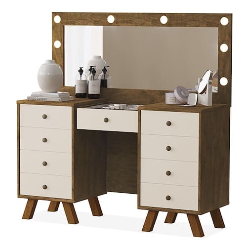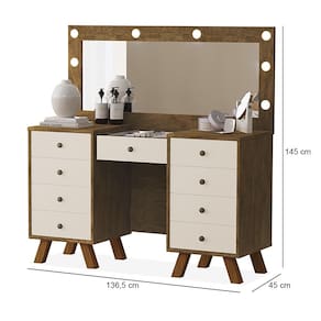Características: Estrutura em MDF e MDP 09 Gavetas com Corrediças Telescópicas Puxador Metalizado Fosco Pés em Madeira Tampo de Vidro Incluso Espelho e Kit Led NÃO ACOMPANHA BANQUETA