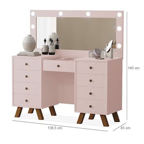 Características: Estrutura em MDF e MDP 09 Gavetas com Corrediças Telescópicas Puxador Metalizado Fosco Pés em Madeira Tampo de Vidro Incluso Espelho e Kit Led NÃO ACOMPANHA BANQUETA