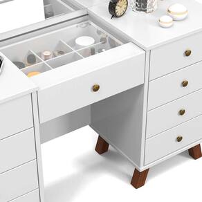 ESPECIFICAÇÕES: Estrutura em MDF Pintura UV 9 Gavetas Corrediças telescópicas Colmeia na gaveta central Vidro no tampo da gaveta central Puxadores em metal acabamento envelhecido 8 Lâmpadas de LED Incluso espelho Pés em madeira de reflorestamento Não acompanha banqueta