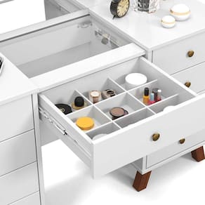 ESPECIFICAÇÕES: Estrutura em MDF Pintura UV 9 Gavetas Corrediças telescópicas Colmeia na gaveta central Vidro no tampo da gaveta central Puxadores em metal acabamento envelhecido 8 Lâmpadas de LED Incluso espelho Pés em madeira de reflorestamento Não acompanha banqueta