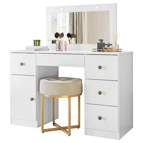 Começou a montar seu quarto? Então apresentamos para você esta bela penteadeira da linha Sonhos. Composto por uma porta e cinco gavetas espaçosas equipadas com corrediças telescópicas. O destaque é para a gaveta central com comeia para melhor organização. O painel com espelho e iluminação em LED garante uma ótima claridade, criando um verdadeiro ambiente de camarim em seu quarto. Fabricado pela Moval, é desenvolvido em MDP de alta qualidade, combinando beleza, praticidade e boa durabilidade. Transforme seu momento em uma experiência única, aproveite!