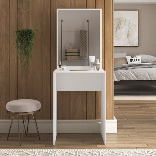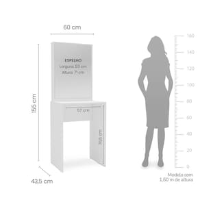 A Penteadeira Porto da Politorno Móveis é a escolha ideal para quem busca praticidade, elegância e excelente custo-benefício em um só produto. Com dimensões compactas — 60 cm de largura, 43,5 cm de profundidade e 155 cm de altura — ela se encaixa perfeitamente em espaços pequenos, sem abrir mão do estilo. Seu design minimalista e sofisticado valoriza qualquer ambiente, tornando o momento de autocuidado ainda mais especial. Produzida em MDP e com acabamento em FF, oferece durabilidade, fácil limpeza e visual moderno. Ter uma penteadeira como essa é mais do que um detalhe na decoração: é um convite diário ao cuidado com a autoestima e bem-estar. Acompanha Banqueta: Não Altura do Espelho: 71 cm Ambiente Principal: Quarto codigo_ean: 7900288187642 Complexidade da Montagem: Baixa: pode ser montado por uma pessoa sozinha Cor: Branco Cor do Produto: Branco Cor Interna: Branco Escala de Brilho: Semi-Fosco Espessura do Espelho: 3 mm Fita Integrada: Sim Formato do Espelho: Retangular Itens Inclusos: 1 Penteadeira, Kit Ferragem, Manual de Montagem e Termo de Garantia Largura do Espelho: 53 cm Linha ou Coleção: Porto Manual de Montagem e Instalação: https://product-hub-prd.madeiramadeira.com.br/818334096/documents/c73484ce-9c04-4e0a-bf8b-b19a8a40b49a3049135622417515662663064.pdf Marca: Politorno Material Principal: MDP Necessita Montagem: Sim Origem do Produto: Nacional Peso: 18,54 kg Possui iluminação: Não Possui Pés: Não Possui Porta Objetos: Não Possui Portas: Não Possui Prateleiras: Não Quantidade de Espelho: 01 Recomendações de Uso, Manutenção e Limpeza: Utilize um pano macio umedecido com água e sabão neutro, seguido de pano seco. Não utilize produtos químicos ou abrasivos para limpeza, pois estes danificam o revestimento do móvel. Sapatas Niveladoras: Não Sistema de Montagem: Cavilha, Parafuso, Minifix e prego. Suporta Até (kg): 10 kg Tipo de Fixação do Espelho: Fita Dupla Face Marca: Não Informado