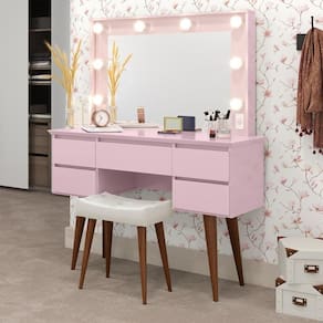 A Penteadeira Camarim Strass é a junção do moderno e útil, uma ótima opção para o seu quarto ou closet, confira! Ela possui 5 gavetas de deslize suave com amplo espaço interno, ótima para armazenar seus objetos pessoais e até conta com interruptor e tomada acoplados para não deixar você na mão! Mas o que chama mais atenção é sem sombra de dúvidas o espelho cercado de lâmpadas de Led, proporcionando uma iluminação perfeita na hora de se maquiar ou tirar aquela selfie!